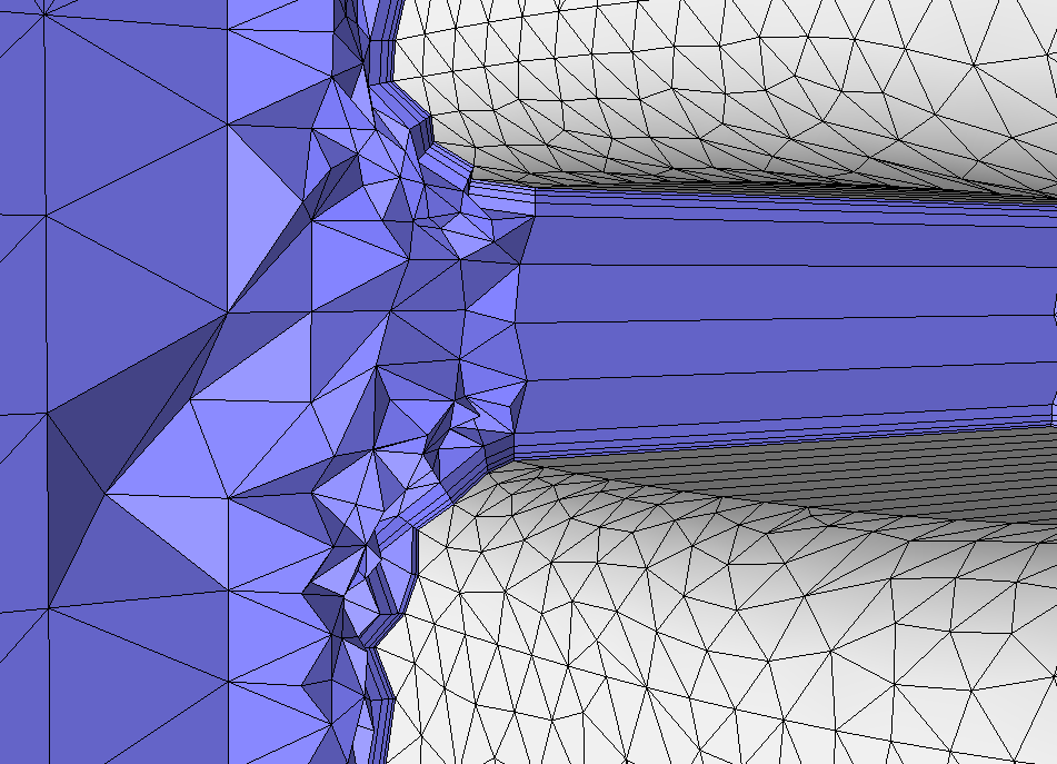 The fins of this model are individual regions that are extruded. There are boundary layers specified to capture flow through the fins. These boundary layers transition from the unstructured mesh seamlessly to the extruded mesh.