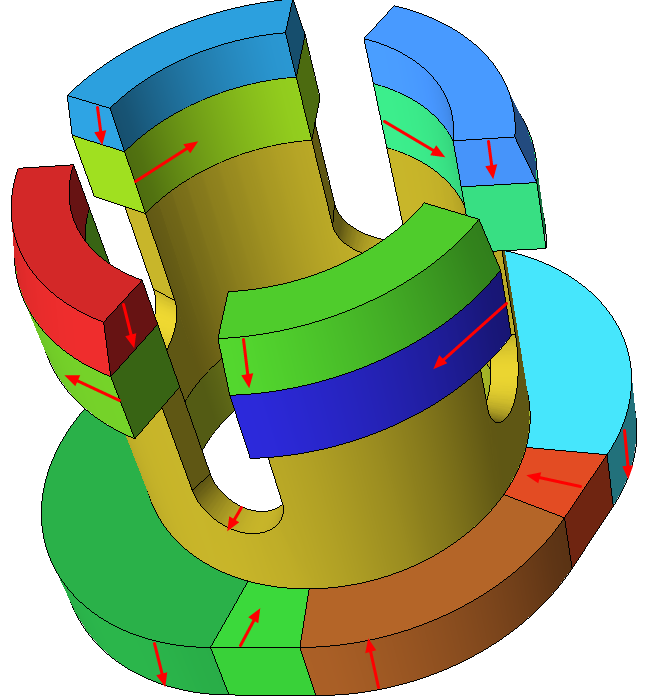 Extrusions may be specified in multiple directions as show by the red arrows. These will be automatically resolved to handle which extrusion should be performed when and in which direction.